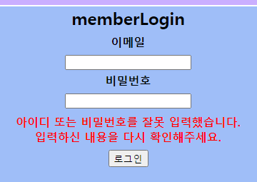 경고문은 loginFalse에 문자열로 담겨 model로 다시 login페이지로 함께 넘어가게 됩니다